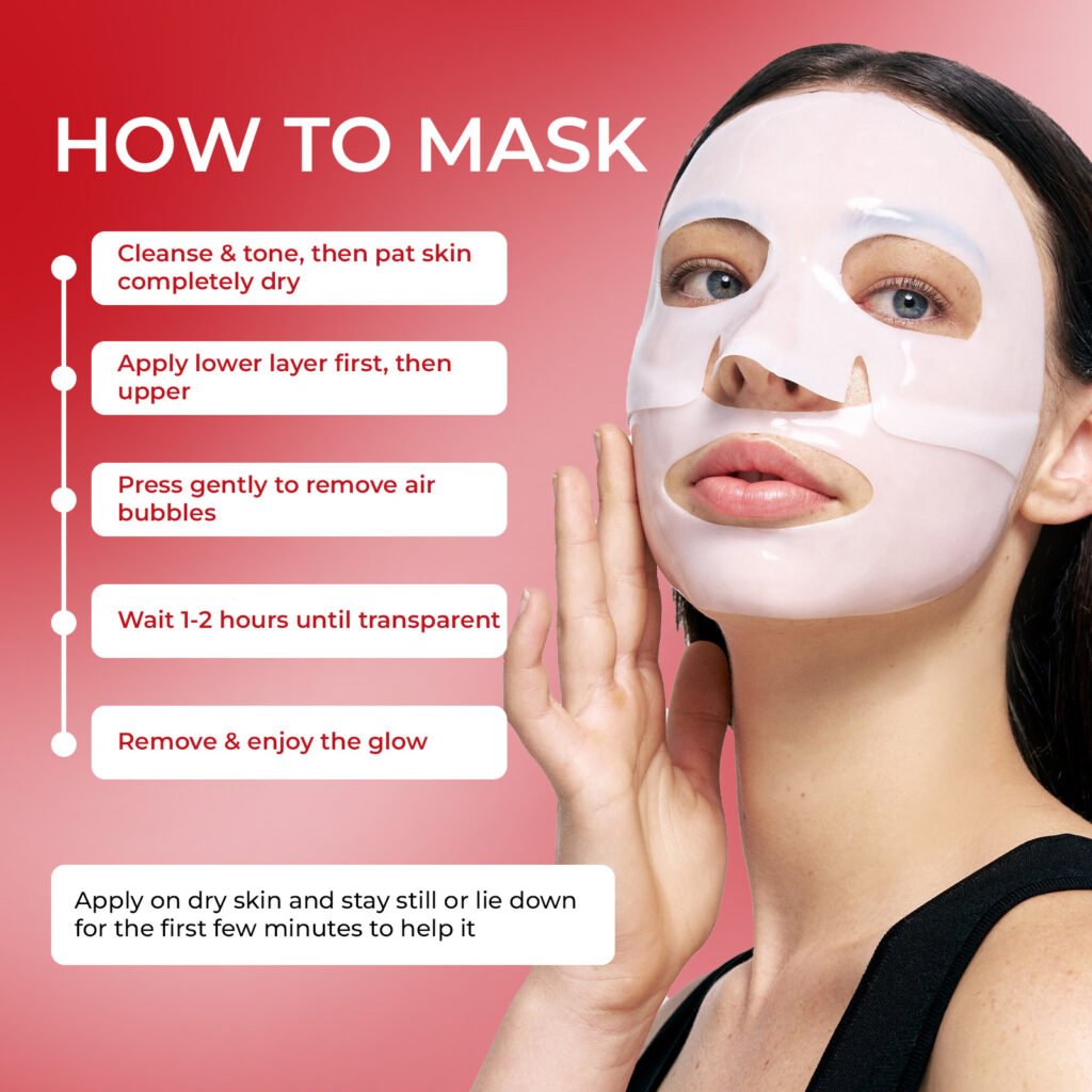 Maximizing the benefits of the Glora. BIO-COLLAGEN REAL DEEP MASK is a simple, five-step process designed to optimize absorption and efficacy. The journey to a glowing complexion begins with proper preparation: Cleanse & tone, then pat your skin completely dry. It is essential to apply the mask to dry skin to ensure the hydrogel adheres securely and the essence can fully penetrate without interference. Next, the mask should be applied in two distinct sections: Apply the lower layer first, then the upper.
