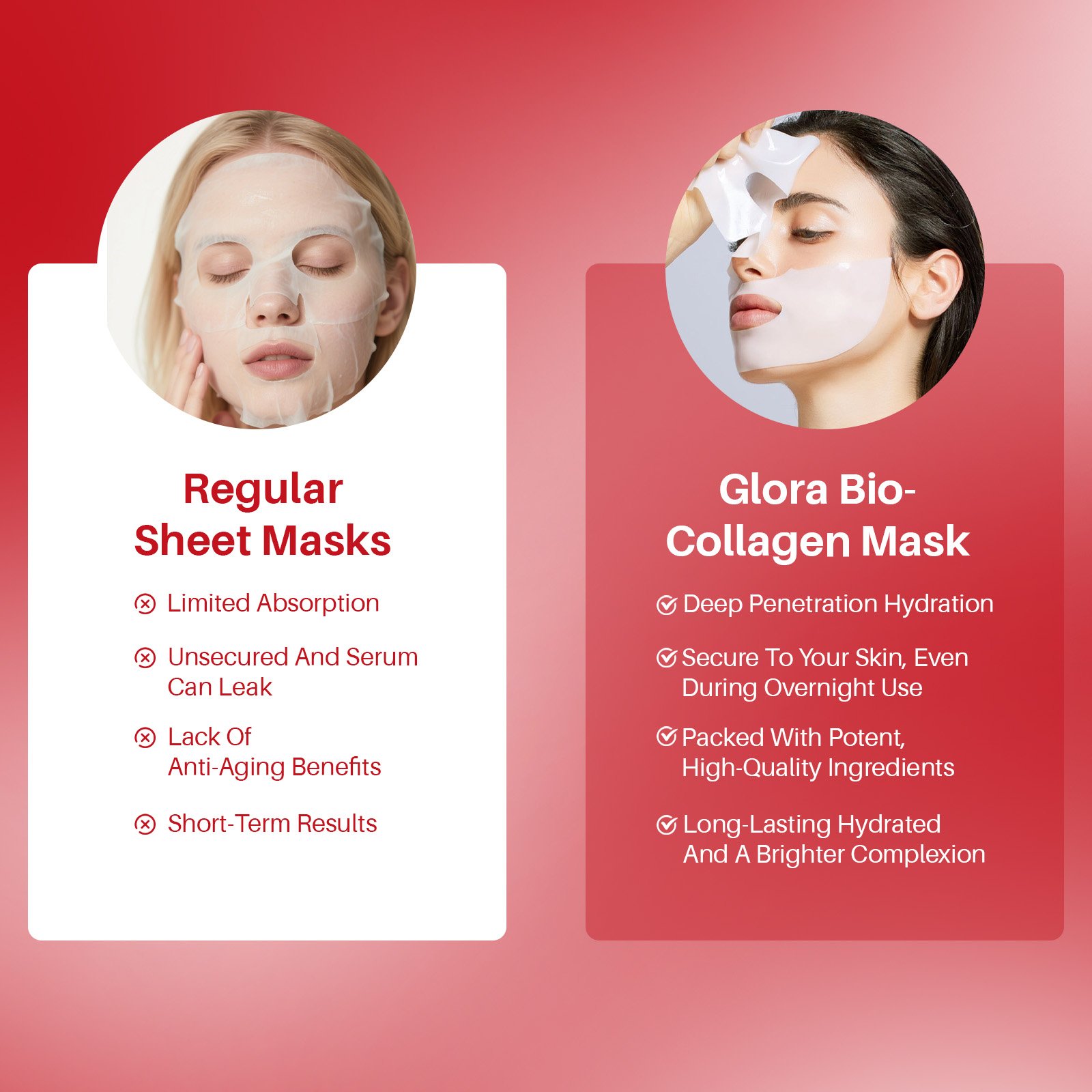 Choosing the Glora. BIO-COLLAGEN REAL DEEP MASK means investing in long-term skin health and superior efficacy over the short-term limitations of regular sheet masks. Where regular masks offer Limited Absorption, the Glora mask promises Deep Penetration Hydration. Where others are Unsecured and Serum Can Leak, the Glora mask is Secure to your skin, even during overnight use. And most critically, where conventional masks Lack Anti-Aging Benefits and provide only Short-Term Results, the Glora mask is Packed With Potent, High-Quality Ingredients and delivers Long-Lasting Hydrated and a Brighter Complexion. This is a product formulated with 83% low molecular collagen and dedicated nutrition that penetrates deep, making the wrinkled and stretched skin firm. The unique 1-2 hour wear time is an intentional design choice to ensure that your skin receives the maximum possible benefit from the high-concentration ingredients. By staying put and steadily transferring its essence until it turns transparent, the Glora mask redefines what a sheet mask can achieve, offering a true deep-mask experience that leaves your skin tender, hydrated, firm, and glowing from within.